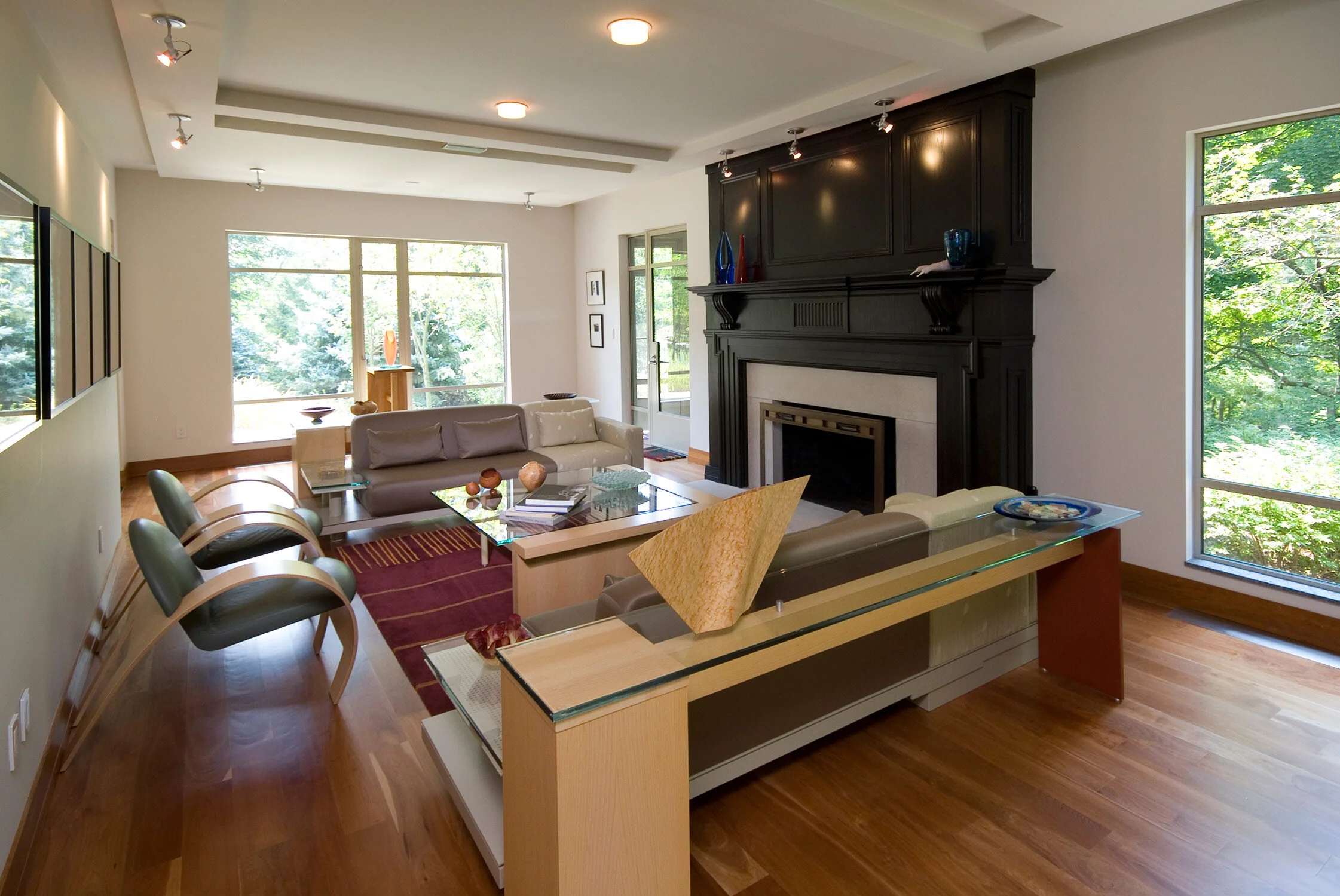 Located on 3 acres of rolling woodlands overlooking the 1836 city canal, this 1917 Gambrel-style colonial suffered from extensive deferred maintenance. In addition to extensive structural reinforcement, new additions provided for expanded entry, living and library space. The plan is organized around an interior courtyard. Granite boulders were split on-site to construct the walls and chimney. Open areas accommodate the Owner's collection of national and regional artists. 2008